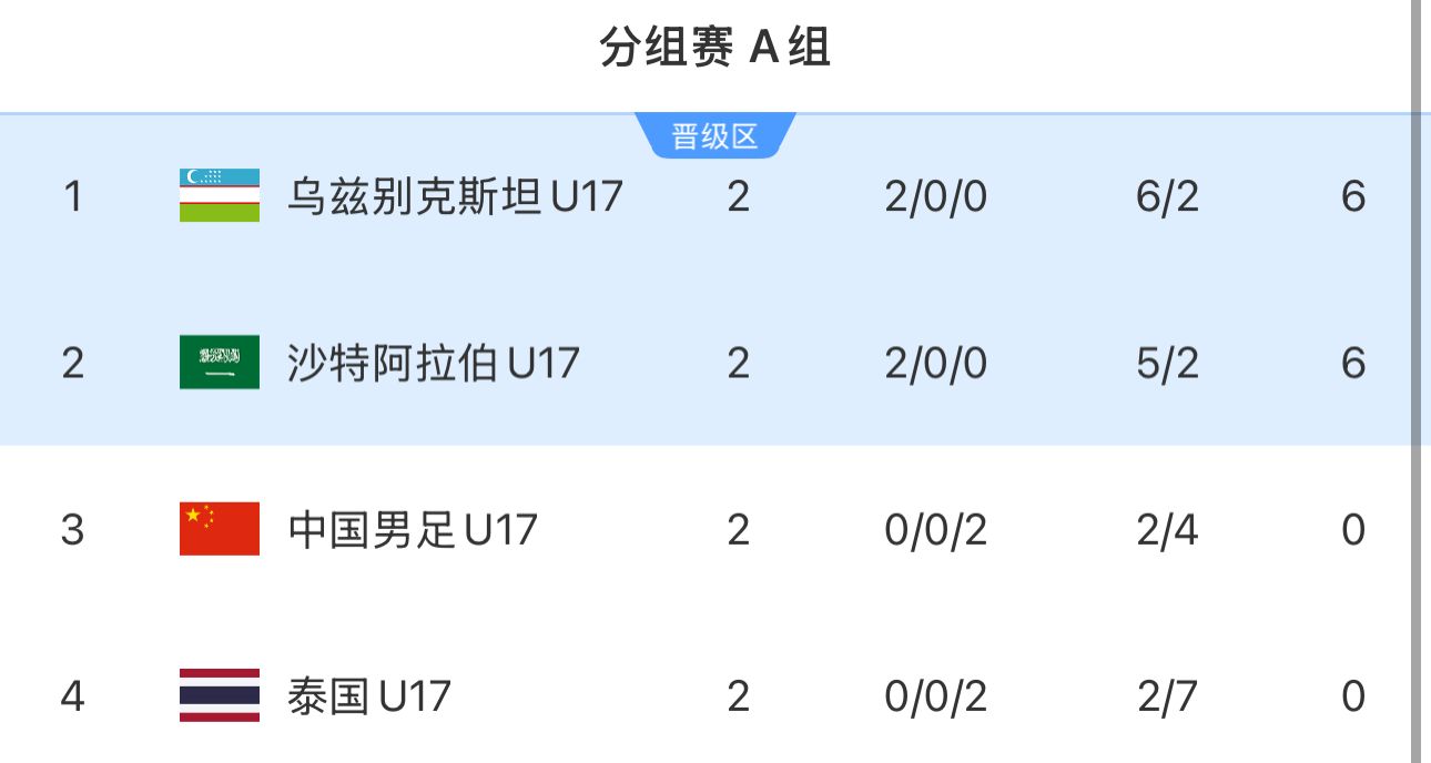 体育直播04月07日讯 U17亚洲杯小组赛A组2轮战罢,国少与泰国U17均两连败提前出局,分列第三和第四。 小组赛最后一轮将于4月10日1点15进行,国少对阵泰国U17。国少如果再输球,将0分垫底出局。