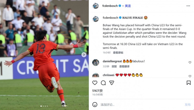 体育直播1月20日讯 荷乙球队邓伯什更新官方ins,祝贺王博豪闯入U23亚洲杯四强。 邓伯什晒出王博豪多张照片,同时配文:王博豪所在的中国U23队已经晋级亚洲杯半决赛。1/4决赛中,中国队与乌兹别克斯坦队打成0-0平进入点球大战,王博豪罚入制胜点球,帮助中国U23队进入下一轮。明天16:30(荷兰当地时间),中国U23队将在半决赛中对阵越南U23队。 王博豪现年20岁,司职中场,去年夏天从陕西联合租借加盟荷乙邓伯什,本赛季至今已经为球队出战15场比赛,包括13场荷乙联赛,并贡献1次助攻。