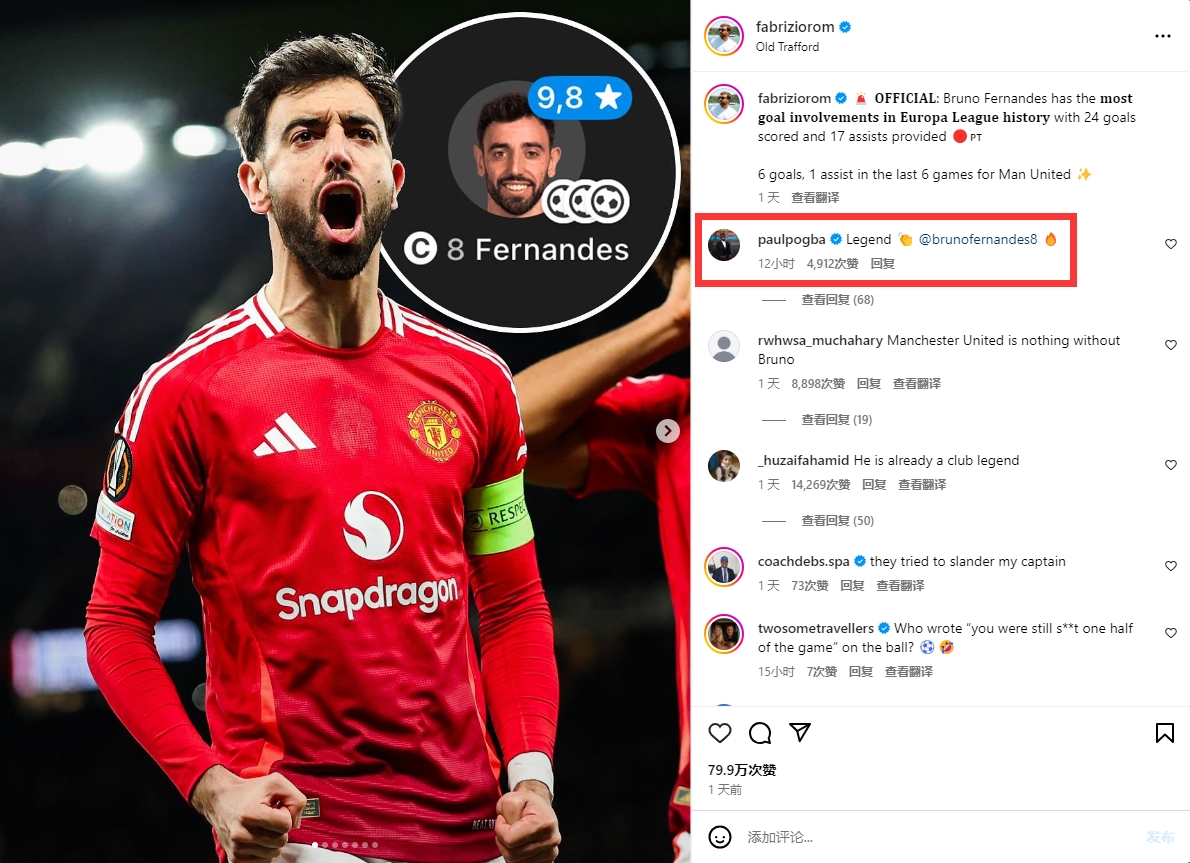 体育直播03月15日讯 欧联杯1/8决赛次回合,曼联4-1淘汰皇家社会,B费帽子戏法率队晋级8强。 名记罗马诺盘点B费纪录:24球17助攻,欧联历史参与进球最多,近6场为曼联出战取得6球1助攻。博格巴评论:“传奇