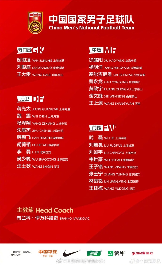 5月22日,中国国家男子足球队与中国U-22国家男子足球队公布新一期集训、参赛名单。山东泰山队总共五人入选,分别是球员王大雷、黄政宇和谢文能入选中国国家男子足球队集训名单,于金永和买乌郎·米吉提入选了中国U-22国家男子足球队集训名单。希望你们在接下来的训练和比赛中展现出良好的竞技状态,认真备战,比赛中顽强拼搏,打出泰山足球精神,为国争光!