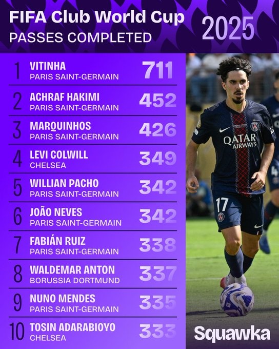 体育直播7月15日讯 世俱杯传球排名:维蒂尼亚711次断层领先,前十巴黎占7位 Squawka统计了世俱杯传球数据,维蒂尼亚完成711次传球,断层领先。 世俱杯传球次数排名: 1、维蒂尼亚(巴黎)——711次 2、阿什拉夫(巴黎)——452次 3、马尔基尼奥斯(巴黎)——426次 4、科尔维尔(切尔西)——349次 5、帕乔(巴黎)、内维斯(巴黎)——342次 7、法比安-鲁伊斯(巴黎)——338次 8、安东(多特蒙德)——337次 9、努诺-门德斯(巴黎)——335次 10、托辛(切尔西)——333次