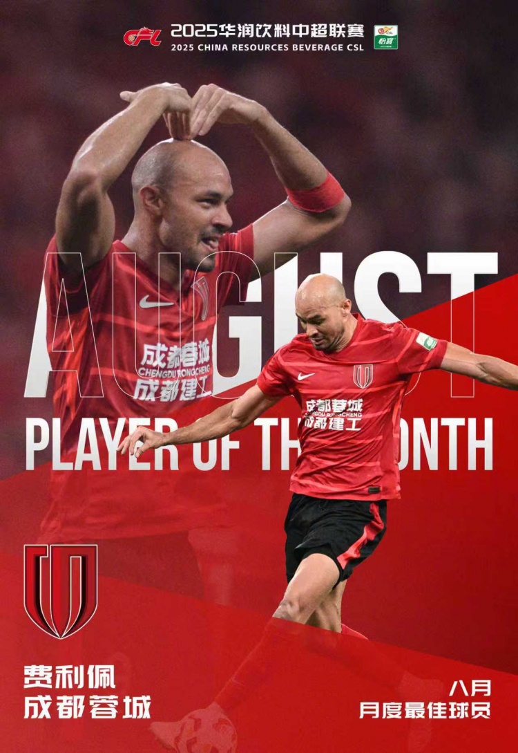 体育直播9月25日讯 中超联赛官方消息,成都蓉城外援费利佩当选8月联赛最佳球员。 在8月份进行的4场中超联赛(注:八月月度评选范围为联赛第19、20、21、22轮共计4轮比赛)中,成都蓉城取得3胜1平的成绩,期间费利佩共打入5个进球,其中包括战泰山和玉昆的两次梅开二度。 据悉,在8月最佳球员的评选中,费利佩在媒体评委会投票环节中获得了9张第一顺位选票和8张第二顺位选票,以63分排名第一;在球迷投票环节,费利佩总票数排名第一获得30分,最终他以总分93分当选为8月中超最佳球员。