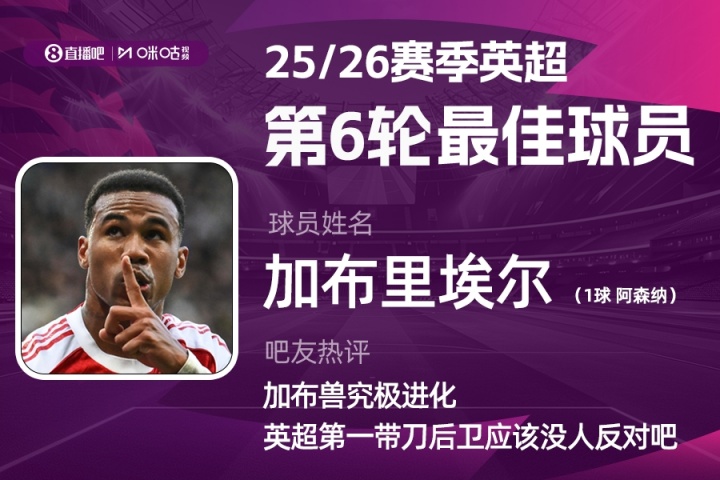 2025-2026赛季英超火热进行中,体育直播和咪咕体育联合发起每轮英超最佳球员评选活动!第六轮评选结果结出炉,加布里埃尔头球绝杀,帮助阿森纳2-1战胜纽卡斯尔,获得吧友8万票的支持,力压哈兰德当选 【体育直播X咪咕体育英超第6轮最佳球员】! 体育直播X咪咕体育|英超第6轮最佳 加布里埃尔补时绝杀,阿森纳2-1纽卡斯尔! 吧友热评:加布兽究极进化;英超第一带刀后卫应该没人反对吧