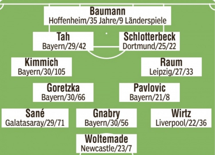 体育直播11月17日讯 北京时间明天凌晨,德国将在欧洲世预赛最后一轮比赛中主场对阵斯洛伐克,《图片报》预测了德国队本场比赛的首发阵容。 图片报预测德国队首发 门将:鲍曼(霍芬海姆) 后卫:基米希(拜仁)、若纳坦·塔(拜仁)、施洛特贝克(多特)、劳姆(莱比锡) 中场:格雷茨卡(拜仁)、帕夫洛维奇(拜仁)、萨内(加拉塔萨雷)、格纳布里(拜仁)、维尔茨(利物浦) 前锋:沃尔特马德(纽卡)