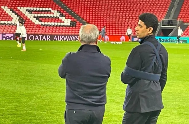 体育直播12月10日讯 《马卡报》报道,巴黎圣日耳曼主席纳赛尔手打石膏,看球队训练。 巴黎圣日耳曼已抵达毕尔巴鄂,俱乐部主席纳赛尔作为球队高层随行。这位卡塔尔人在团队抵达前,已于当天下午早些时候乘另一航班飞抵毕尔巴鄂,而路易斯·恩里克的球队则搭乘其他航班抵达。 尽管纳赛尔在11月27日因手腕骨折接受了手术,但他仍坚持随队出行。此外,纳赛尔的肩膀也受了伤,左臂佩戴着悬吊带。 在体育总监路易斯·坎波斯的陪同下,纳赛尔于圣马梅斯球场的草坪边观看了球队训练。两位高层毫无顾忌地在密切关注训练过程的记者附近交谈。就在巴黎圣日耳曼在毕尔巴鄂训练的几个小时前,俱乐部的投资集团宣布通过收购一家比利时俱乐部来拓展业务。 52岁的纳赛尔是卡塔尔体育投资公司的高管,自2011年起担任巴黎圣日耳曼主席。他是这家巴黎俱乐部历史上的首位非法国籍主席,纳赛尔还担任卡塔尔的部长职务,但未具体分管部门。同时,纳赛尔还是欧洲俱乐部协会(ECA)主席,他的另一大爱好是网球,他曾是一名职业网球运动员。