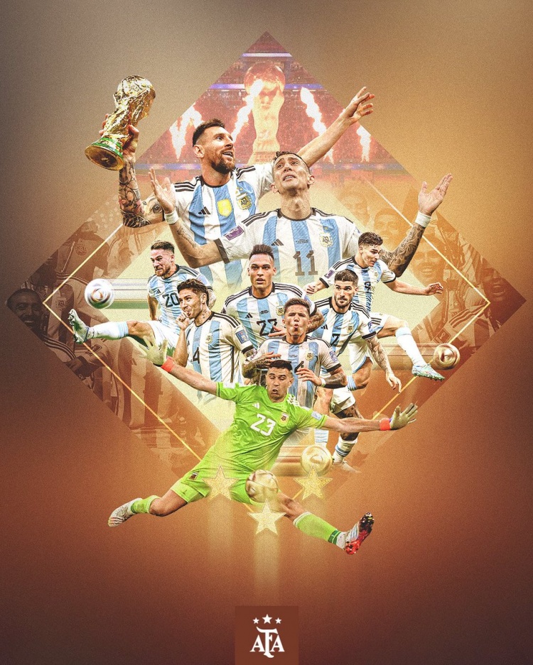 体育直播12月18日讯 三年前的今天,阿根廷赢得卡塔尔世界杯冠军。 2022年12月18日,阿根廷在世界杯决赛中对阵法国,两队120分钟3-3战平,最终阿根廷点球大战取胜,队史第三次赢得世界杯冠军。 阿根廷队官方社媒晒出海报,纪念球队夺得世界杯冠军三周年,梅西、迪马利亚、大马丁等球员出镜。